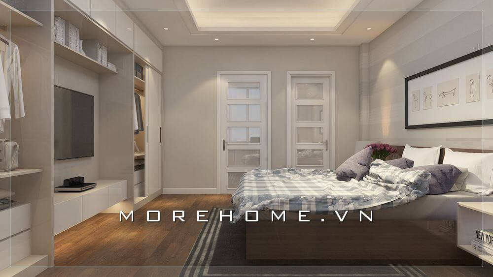 Giường ngủ thấp với lối thiết kế hiện đại, đơn giản được lựa chọn mang lại cho không gian phòng ngủ chung cư nhỏ thêm phần rộng thoáng và thanh lịch