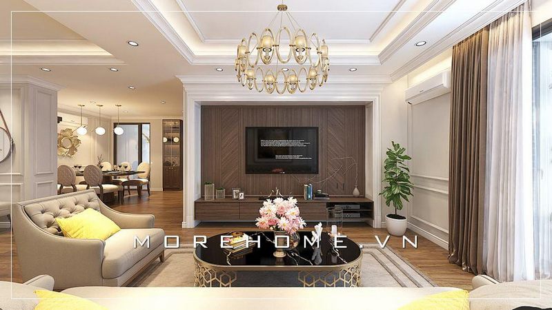 Vẻ đẹp sang trọng, đẳng cấp của bộ sofa gỗ óc chó thiết kế theo phong cách tân cổ điển nghệ thuật kết hợp cùng chất liệu nhung êm ái là tâm điểm của nội thất phòng khách căn hộ chung cư thông tầng.