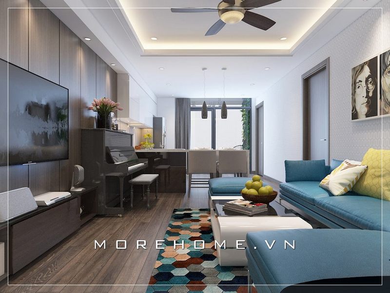 Vẻ đẹp tươi mới đầy sức sống của phòng khách căn hộ với tâm điểm là bộ sofa thiết kế kiểu dáng góc theo phong cách hiện đại kết hợp cùng vỏ bọc da màu xanh độc đáo và chân sắt tinh tế.