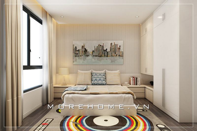 Nội thất phòng ngủ nhỏ gỗ công nghiệp hiện đại với gam trắng - vàng chủ đạo mang lại không gian nghỉ ngơi đầy thư giãn và ấm áp