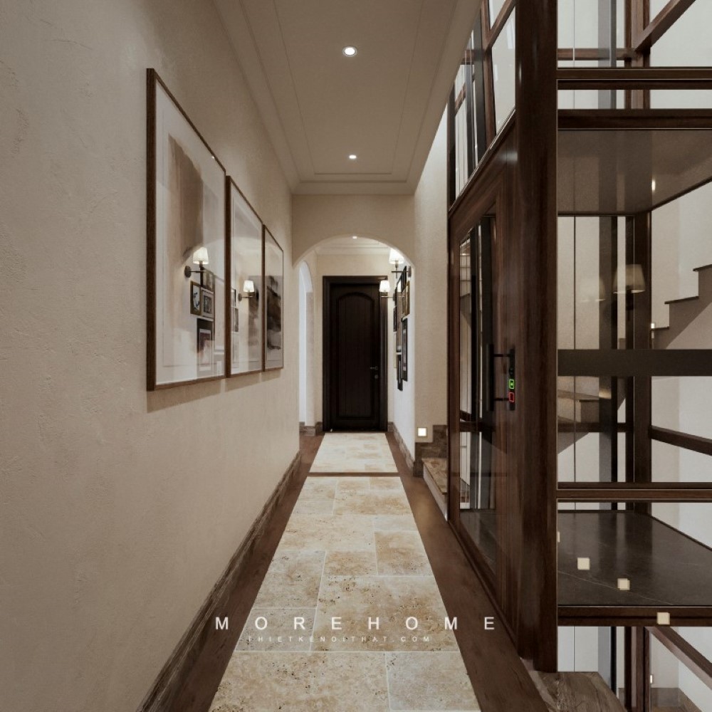 Để tránh sự nhàm chán khi sử dụng tông trắng làm chủ đạo, KTS Morehome đã khéo léo kết hợp gạch ốp tường và gạch lát sàn phòng tắm màu tối để tạo điểm nhấn, kết hợp vách kính tắm cường lực 2 bên giúp tạo sự liên kết trong không gian ngôi nhà