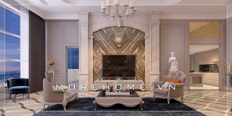 Để hoàn thiện phòng khách của căn biệt thự tân cổ điển, Morestone thi công đá ốp tường tự nhiên có vân đối nhau đem đến sự cao cấp, sang trọng mà thời thượng cho căn phòng.