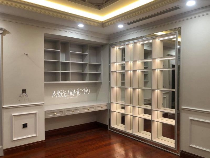 Kệ trang trí kết hợp kệ sách gỗ đẹp kết hợp thiết kế gương ốp tủ độc đáo cho không gian nội thất phòng khách thêm ấn tượng hơn