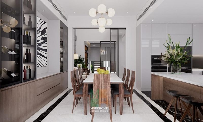 Trang trí phòng ăn không gian mở thoáng đãng sử dụng hợp lí nội thất sắp xếp khoa học tiện lợi.
