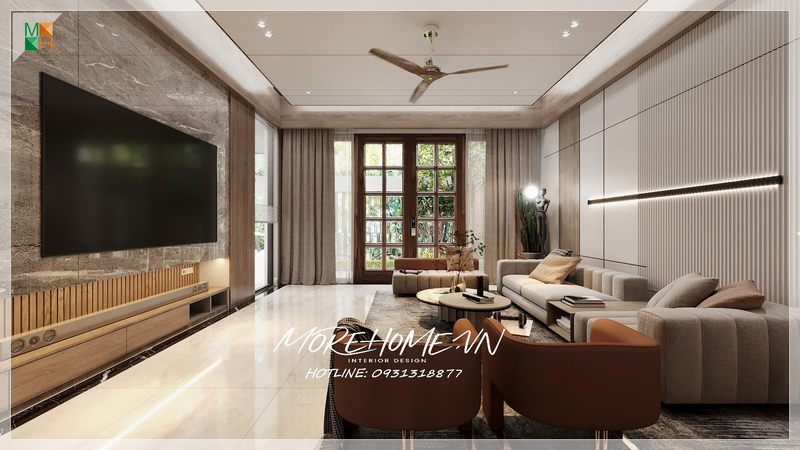 Trong quá trình thiết kế phòng khách, màu sắc không chỉ đơn giản là chọn lựa ngẫu nhiên mà cần phải cân nhắc kỹ lưỡng để tạo ra sự hài hòa và đẳng cấp. Một bảng phối màu tối giản với các tông màu trung tính như xám, be, hay trắng sữa có thể mang đến cảm giác sang trọng và tinh tế. Để làm nổi bật không gian, bạn có thể thêm những điểm nhấn bằng các mảng màu đậm như xanh navy hoặc đỏ burgundy ở một vài chi tiết nội thất.