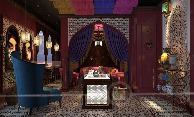 Làm cho không gian phòng thư giãn của bạn trở nên ấn tượng bằng cách trang trí nội thất với tông màu chủ đạo là màu mận tím theo phong cách Ấn Độ và thưởng thức trà.